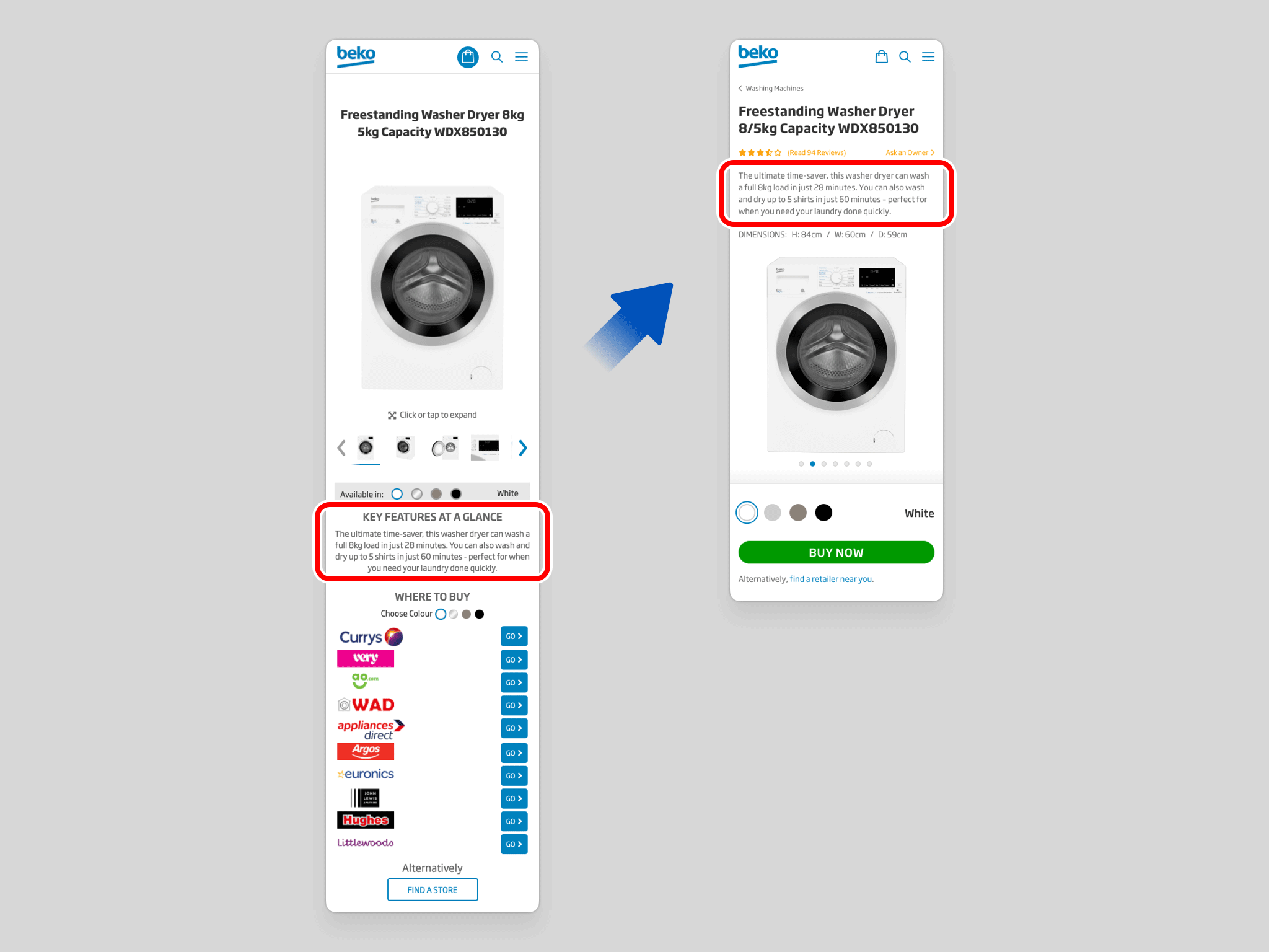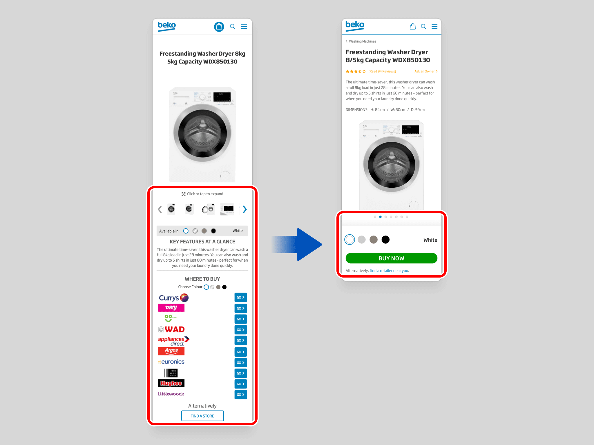 Among a broader set of refinements to purchasing, the most significant change is the consolidation of the entire and overwhelming WHERE TO BUY section into a single, focused BUY NOW button.