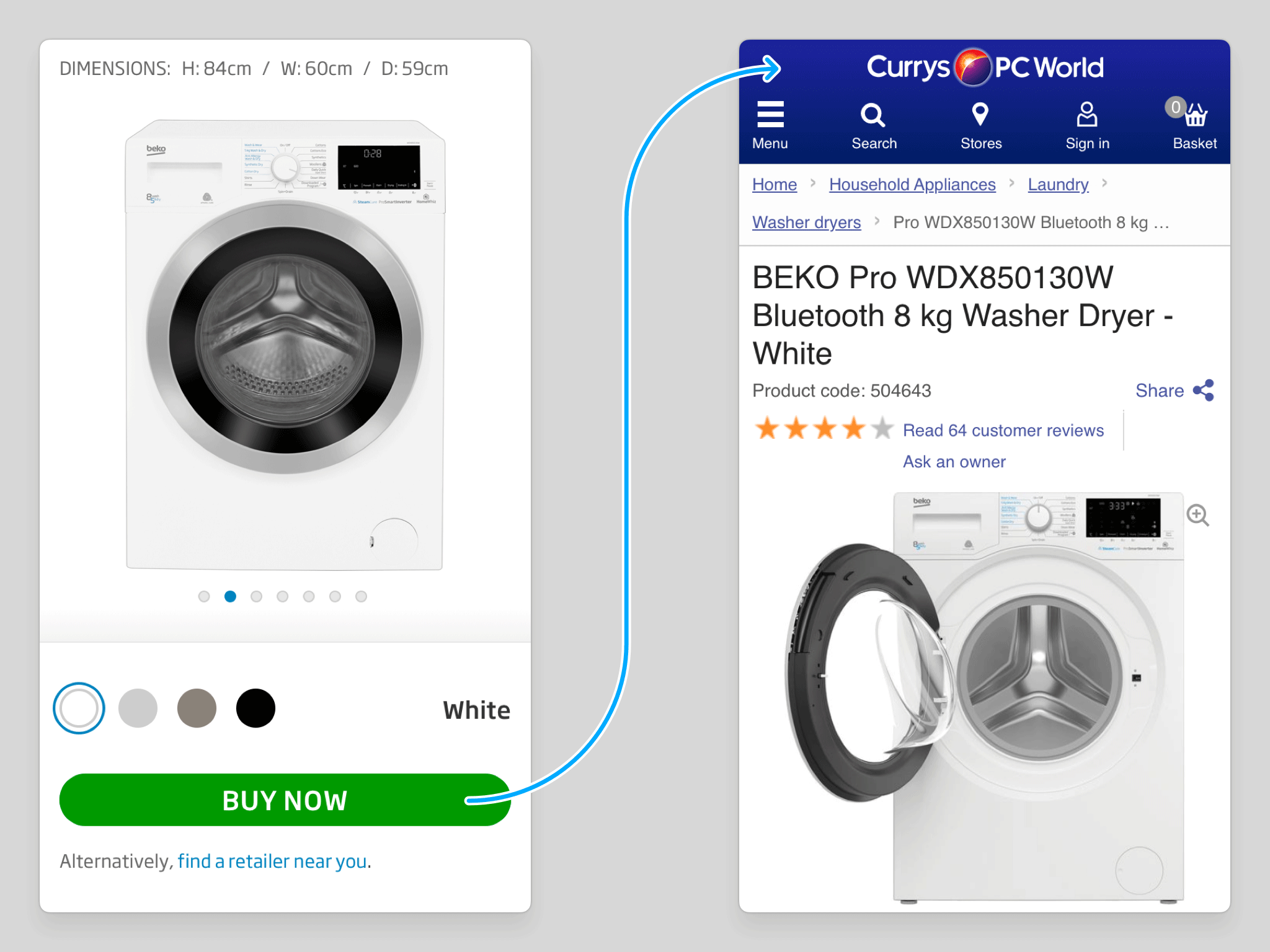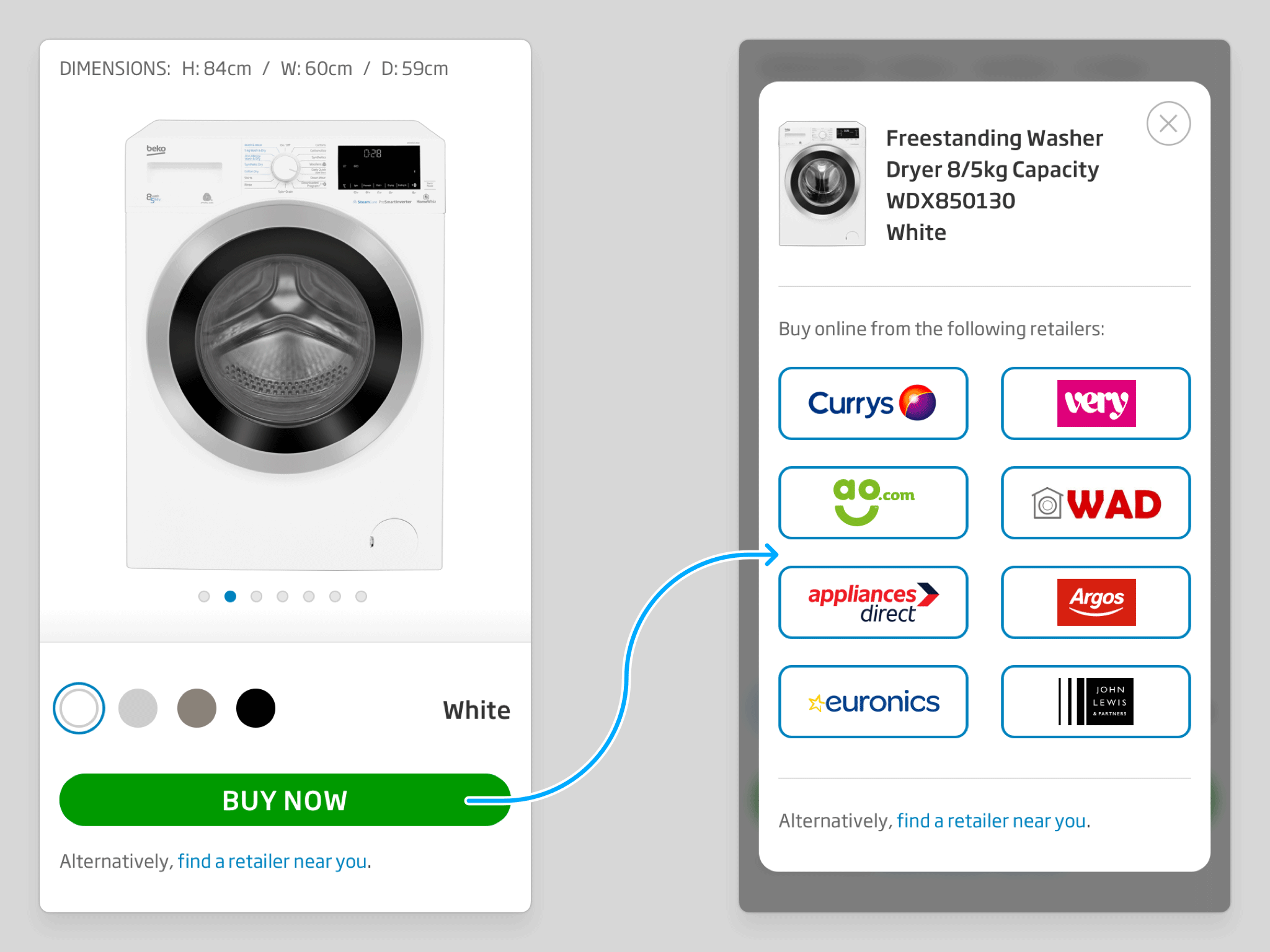 Where only a single retailer is available, the BUY NOW button routes the user directly to that retailer's site. With just one option at the second stage, an intermediary modal serves no purpose — so it is bypassed entirely, and the path to purchase is as direct as possible.