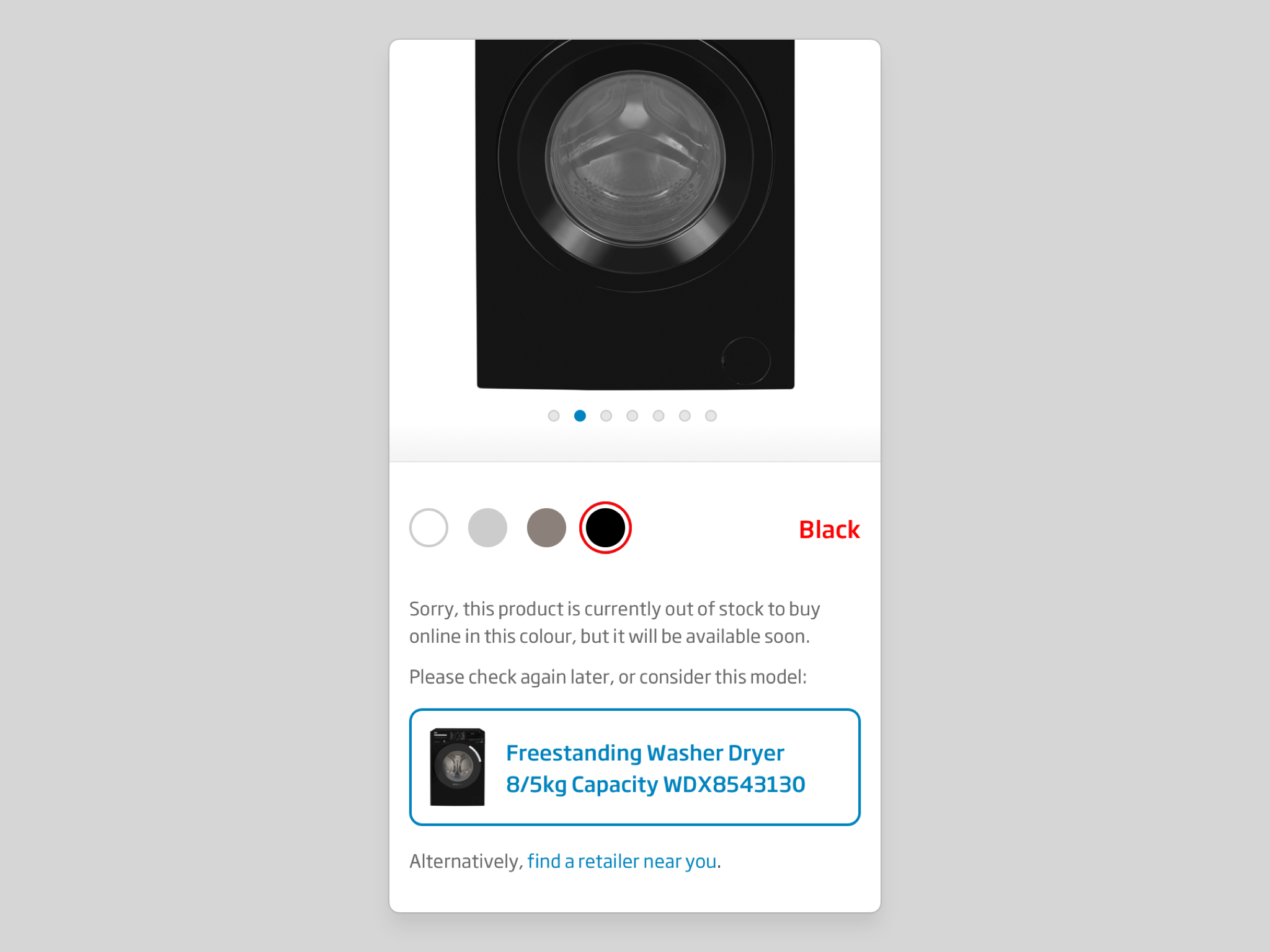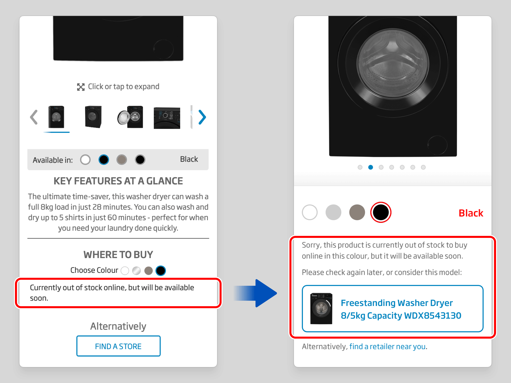 Out-of-stock states previously offered little more than a dead end. The redesign makes unavailability explicit — and, more importantly, pairs that message with a proactive suggestion: an equivalent model in the same colour, positioned as the natural next step. The user stays on the site, their intent is met with a helpful alternative, and the outcome remains constructive rather than dismissive.