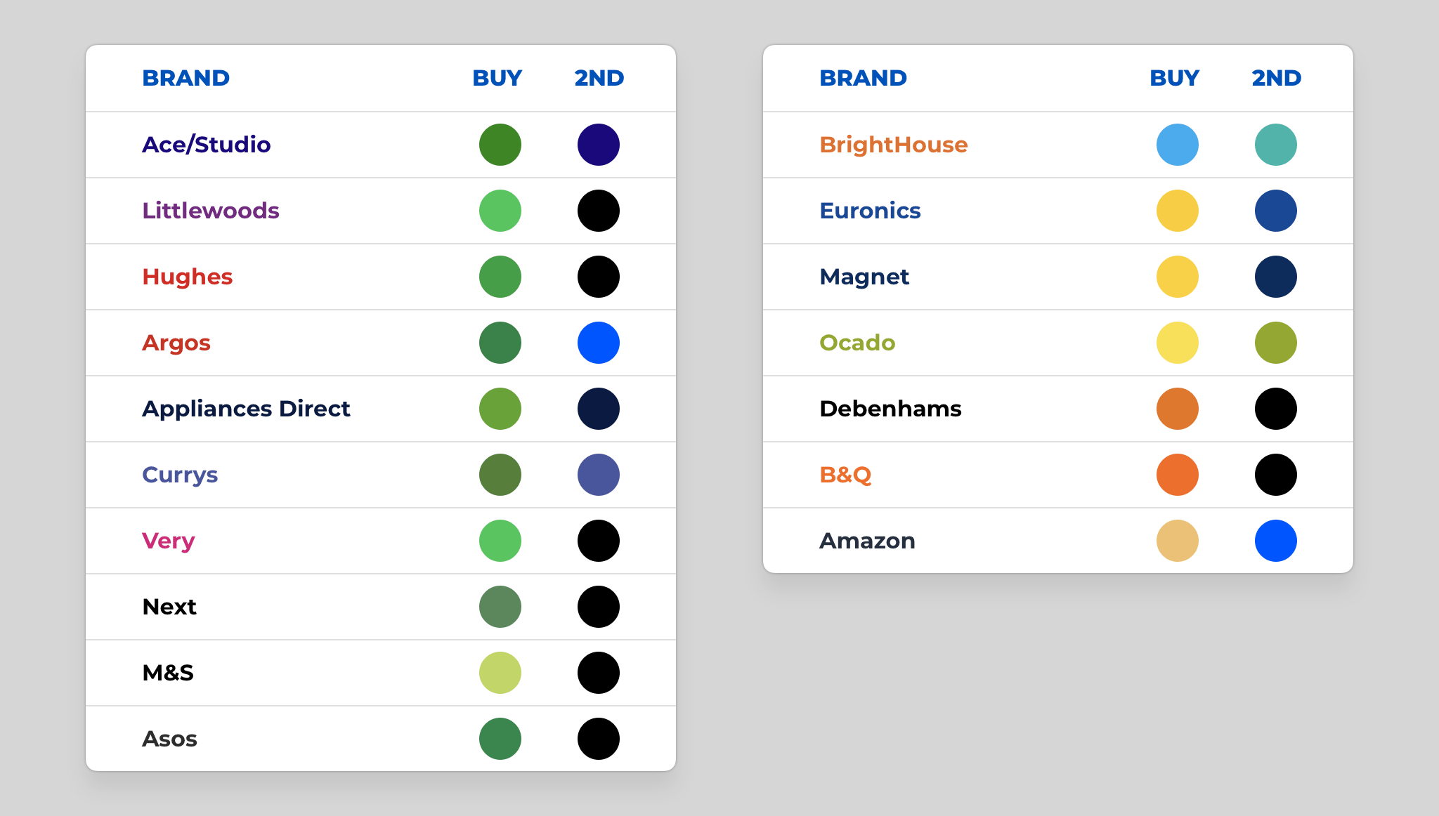 Showing competitor's website colours, where they use green for their Buy CTA (left), and where they use a contrasting colour to their secondary colour, even if not green (right).
