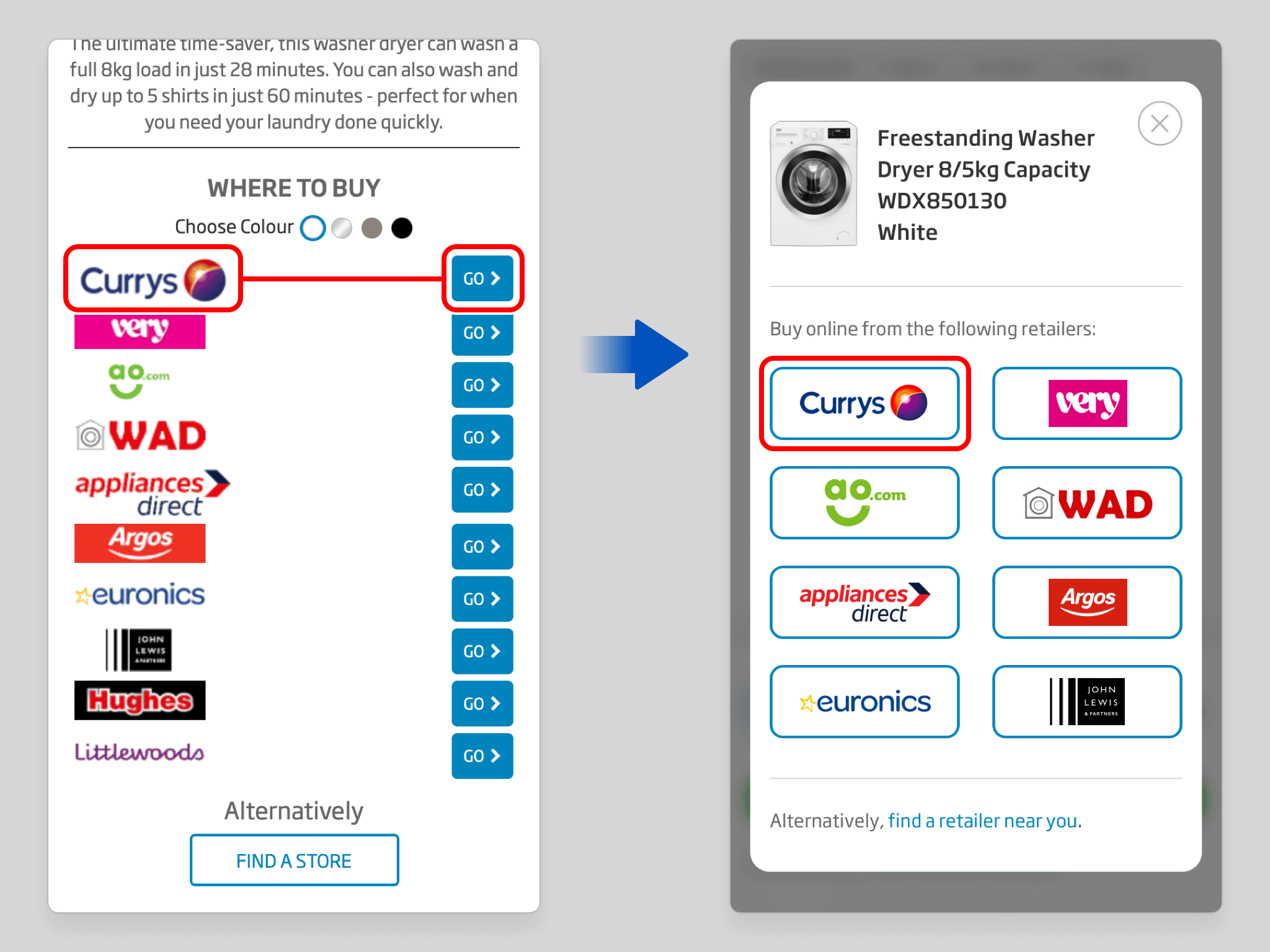 Within the retailer modal, each retailer's logo and its corresponding action button have been merged into a single interactive element. Previously, a row of logos paired with a separate column of “Go” buttons created unnecessary duplication and a weak link between brand and intent. The consolidated treatment makes both the association and the action immediately legible.