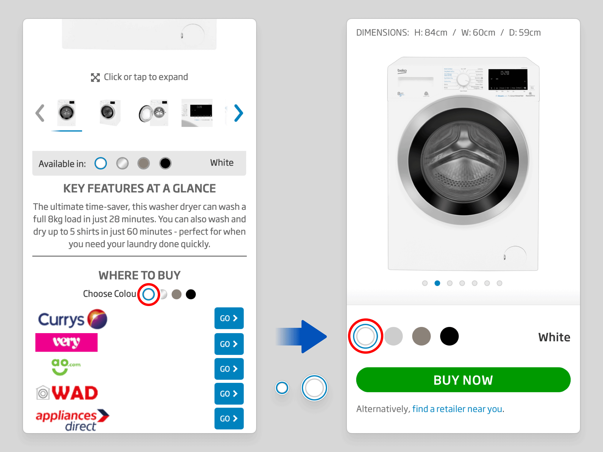Two separate colour selectors — one governing the Gallery, one governing the Buy section — have been consolidated into a single control that manages both simultaneously. The duplication previously created a disjointed experience, obscuring the direct relationship between the variant being viewed and the one being purchased.