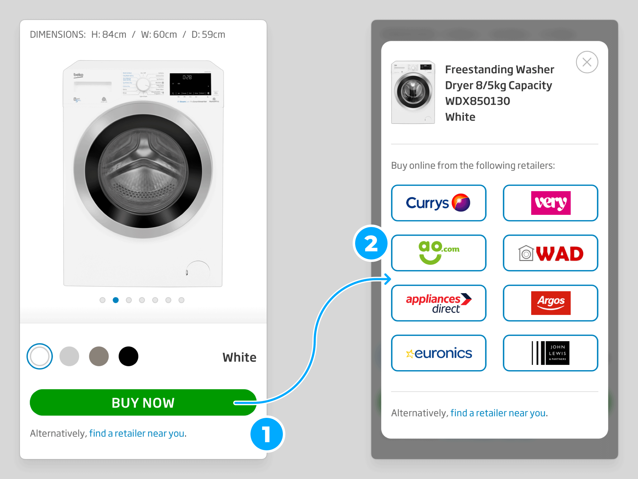 Where only a single retailer is available, the BUY NOW button routes the user directly to that retailer's site. With just one option at the second stage, an intermediary modal serves no purpose — so it is bypassed entirely, and the path to purchase is as direct as possible.