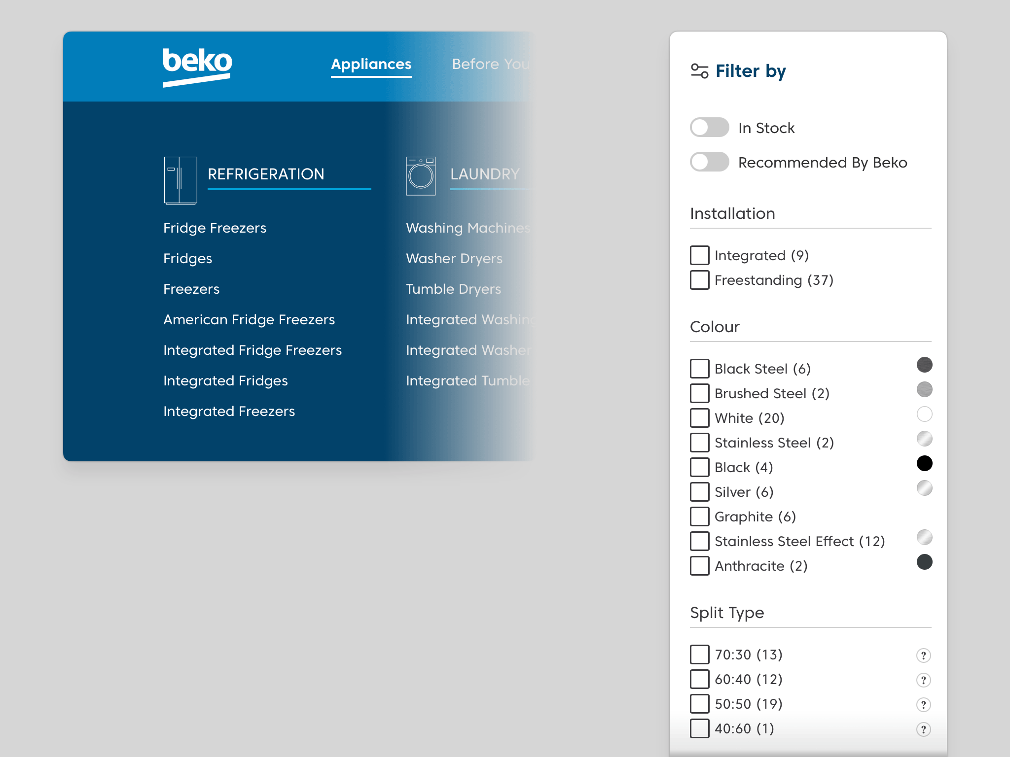 This principle is already applied effectively elsewhere on the site; the Refrigeration navigation, for instance, first presents an overview of all Fridge Freezers, then allows refinement through filters on the following page. The same logic applies here.