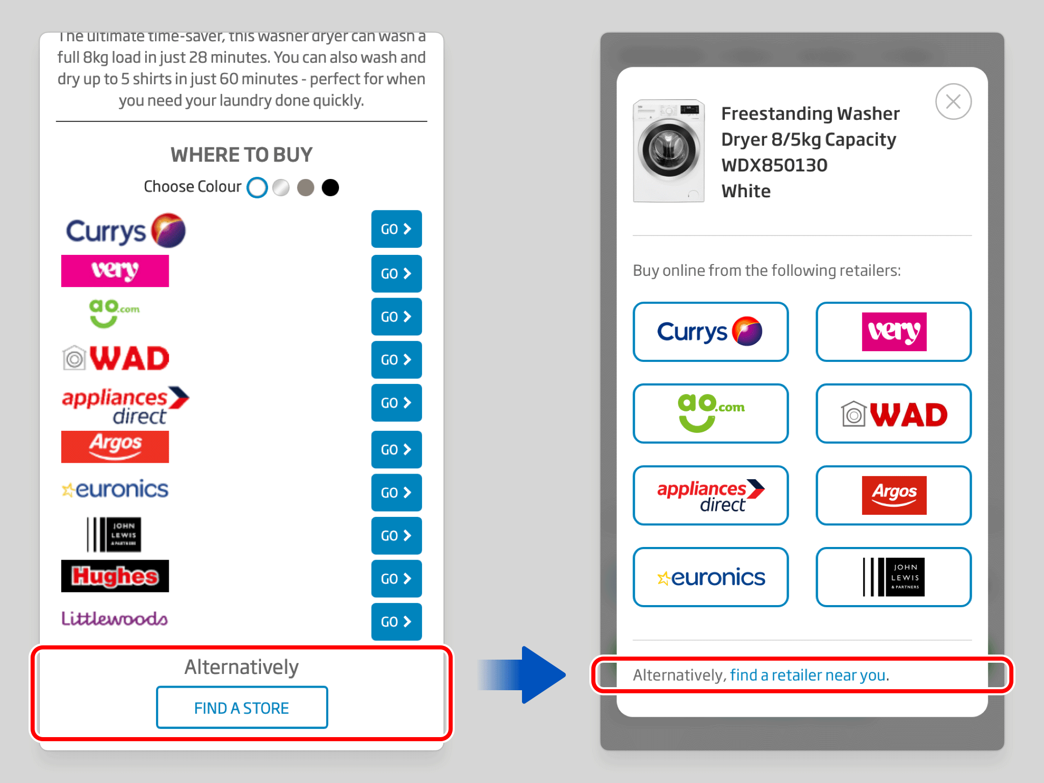 The “Find A Store” option has been demoted from a button to a text link — a small change that accurately reflects its relative significance. In the previous design it sat at the same visual weight as the purchase options, implying a parity that was never warranted. Locating a physical store is a secondary behaviour; the design now communicates that clearly.