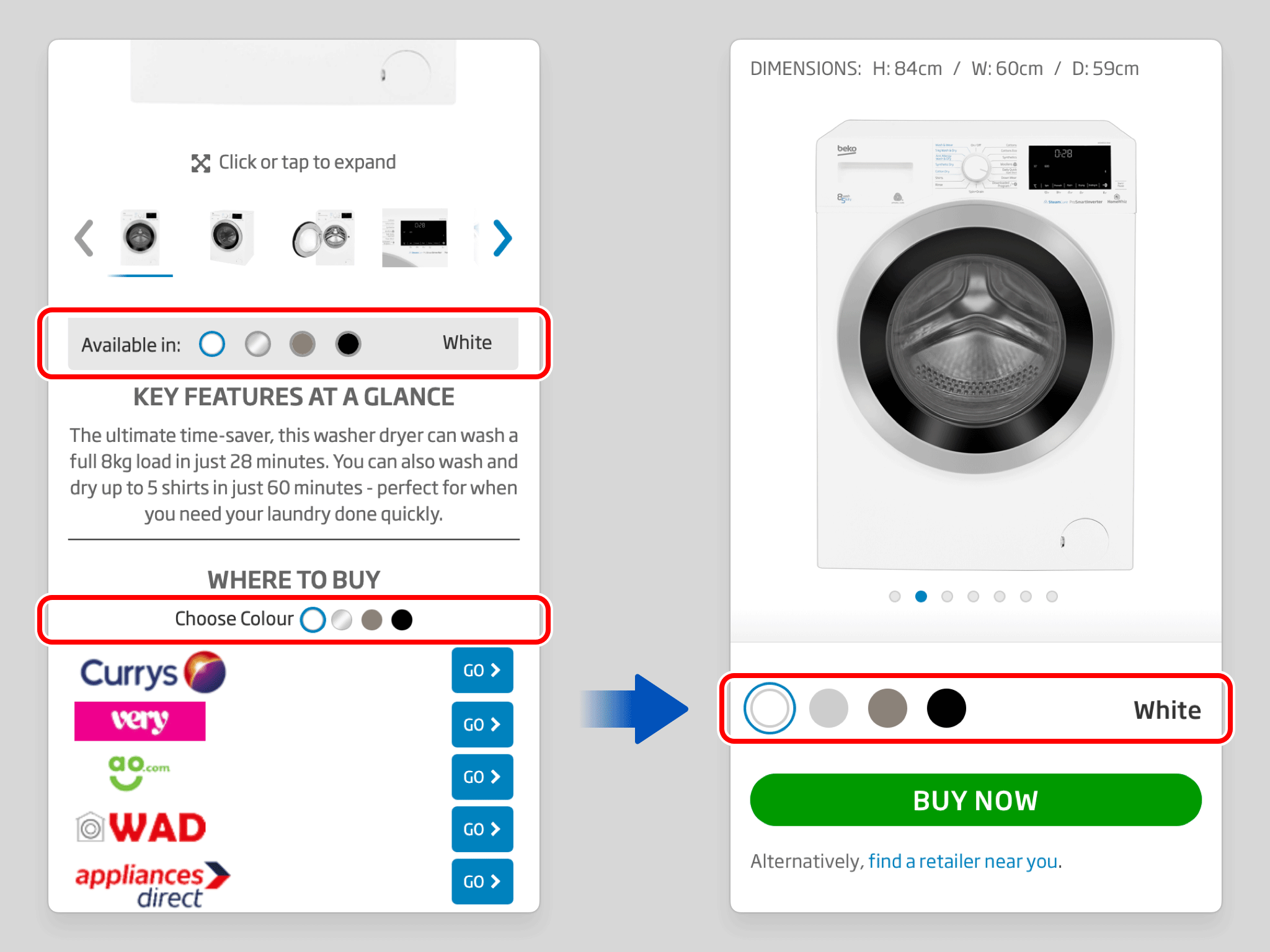 Two separate colour selectors — one governing the Gallery, one governing the Buy section — have been consolidated into a single control that manages both simultaneously. The duplication previously created a disjointed experience, obscuring the direct relationship between the variant being viewed and the one being purchased.